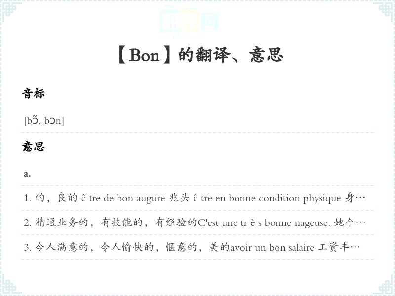 放在句首,表示祝愿Bonnes vacances ! 假期愉快!Bonne continuation 再接再励Bon rétablissement ! 早日康复!Bon voyage ! 旅行愉快!adv.sentir bon 香, 有香味 tenir bon 坚持coûter bon 价格昂贵Il fait bon. 气候宜人。天气。Il fait bon dans ta chambre. 你的卧室很温馨。Il fait bon se promener. 散散步非常愉快。Il ne fait pas bon avoir affaire à cet homme. 同个人打交道真愉快。同个人打交道真危险。n.m.