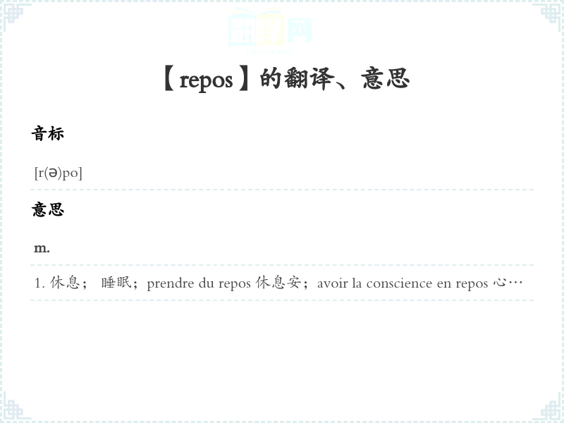 休息; 睡眠;prendre du repos 休息安;avoir la conscience en repos 心安理得le repos de la mer 大海风浪休止, 止; 停顿; [军]稍息; 楼梯台