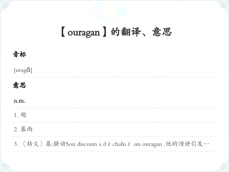 〈转义〉暴;骚动Son discours a déchaîné un ouragan .他的演讲引发了一阵骚动。