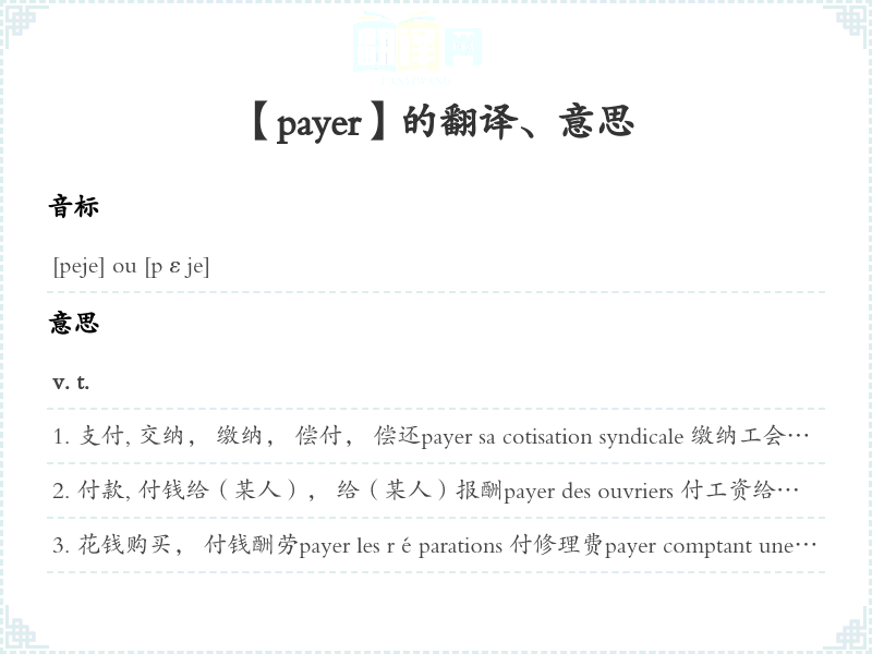 花钱购买, 付钱酬劳payer les réparations 付修理费payer comptant une marchandise 付现钞买一件商品travail bien (mal) payé 报酬()工作Combien avez-vous payé votre vélo? 你买辆自行车花了多少钱?Mon père m'a payé un stylo. [转]我父亲替我买了一支钢笔。 Viens, je te paie un verre. [转]来, 我请你喝一杯。 un succès qu'on paie cher [转]付出很大代价获得成功。 Il me le paiera. [转]笔帐我会跟他算。