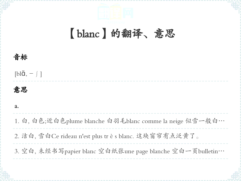 白, 白色;近白色plume blanche 白羽毛blanc comme la neige 似雪一般白, 雪白cheveux blancs 白发vin blanc 白葡萄酒race blanche 白色人种avoir le teint blanc 肤色白皙être blanc 面色苍白;(由于激动或害怕而)面色发白;未被晒黑sauce blanche 白汁 [用黄油和面粉调成白色调味汁]gelée blanche 白霜arme blanche 白刃 [指刀剑, 与 arme à feu 相对]métal blanc 白合金, (做餐具用)锡基合金verre blanc 色透明玻璃produits blancs 白色家电 [指冰箱、洗衣机等, 因白色外壳而得名]bois blanc 白色木opération blanche 不盈不亏交易lumière blanche【物理学】白光bruit blan【物理学】白噪音salle blanche 尘操作室eau blanche【药学】白色洗剂 [硷性醋酸铅液]mal blanc【医学】瘭疽pères blancs (非洲)白衣传教会会员hisser le drapeau blanc 挂白旗(投降)faire chou blanc 〈口语〉未击中, 失败C'est bonnet blanc et blanc bonnet.〈谚语〉这是半斤八两。