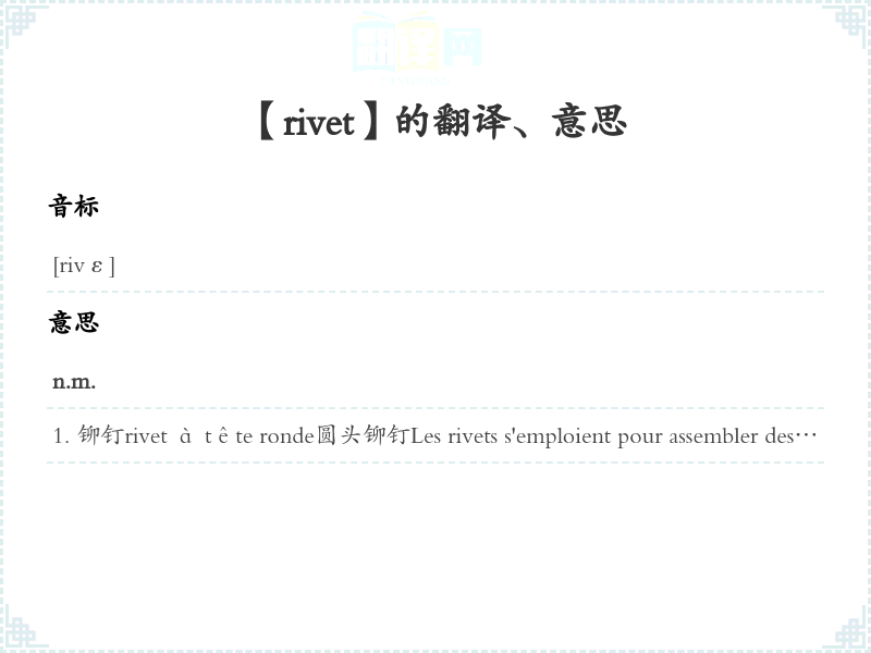 铆钉rivet à tête ronde圆头铆钉Les rivets s'emploient pour assembler des plaques métalliques.铆钉用以铆合金属板。[人名]里韦
