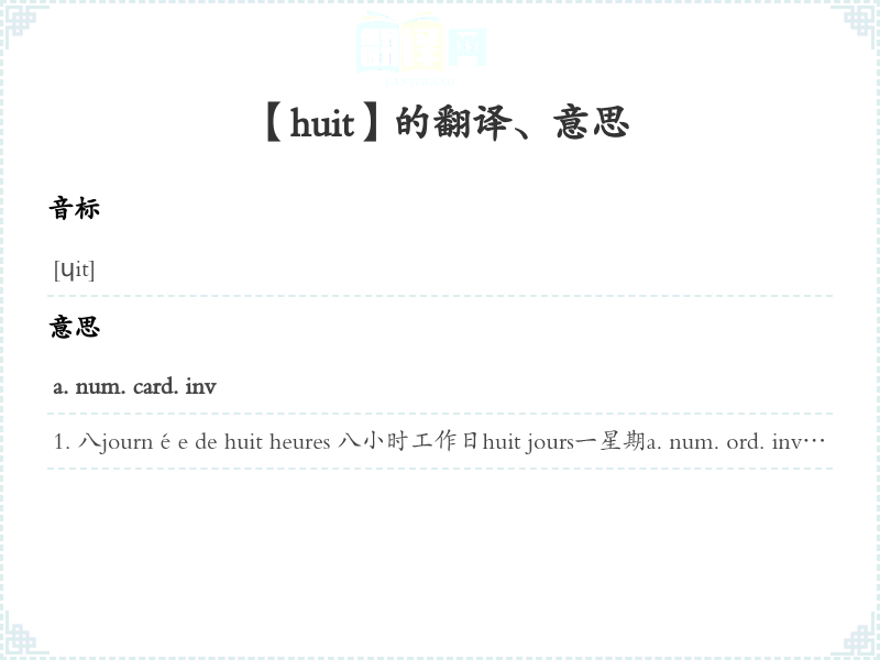 1 八; 八字Deux fois huit, seize.二乘八于六。2(一个月份的)八日; 八点钟; (房屋或房间的)八号Je partirai le huit du mois prochain.我将于下个月8号动身。J'habite au huit de la rue Boileau.我住在布瓦洛街8号。3(的)八点le huit de carreau方块84 8字形le grand huit翻滚过山车