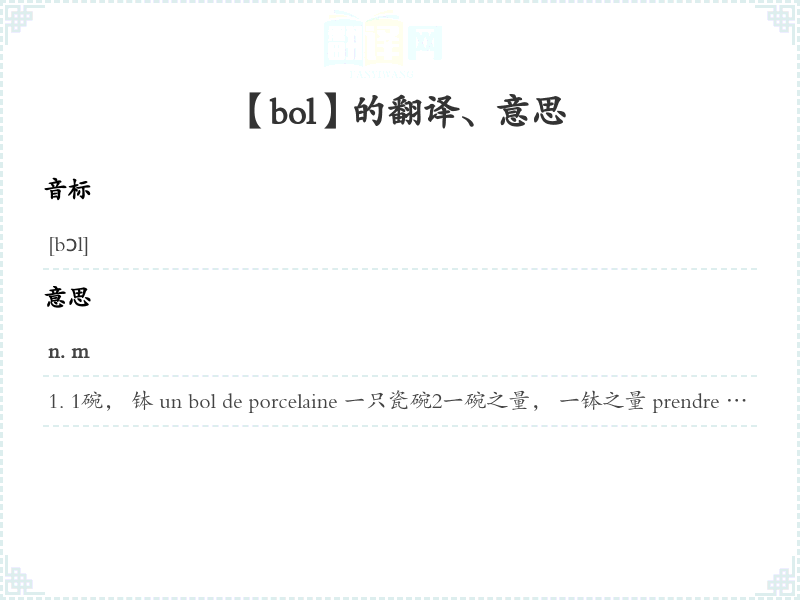 1碗, 钵 un bol de porcelaine 一只瓷碗2一碗之量, 一钵之量 prendre un bol d'air 去呼吸新鲜空气 3<口>运气ne pas se casser le bol 不着急,不担忧口>