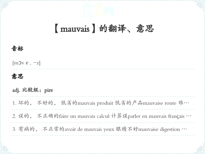 艰苦的, 困难的, 不快的passer un mauvais quart d'heure 度过艰难的时刻faire un mauvais rêve 做一个恶梦faire courir de mauvais bruits sur qn. 散步有关某人的语prendre qch. en mauvaise part 从坏处去想某事la trouve [l'avoir] mauvaise <口>感到十分不快trouver mauvais que (+subj.) 认为…不好口>1