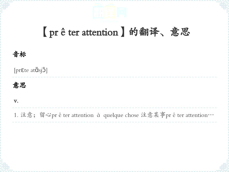 注意;留心prêter attention à quelque chose 注意某事prêter attention aux conseils 注意建议prêter attention aux détails 注意细节