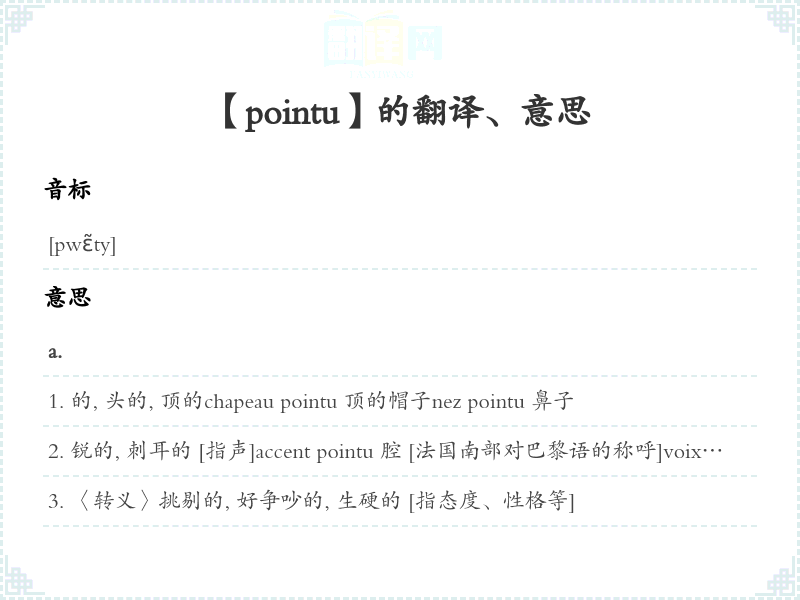 锐的, 刺耳的 [指声]accent pointu 腔 [法国南部对巴黎语的称呼]voix pointue刺耳的嗓门