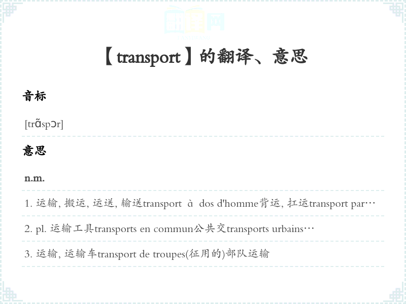 运输, 搬运, 运送, 输送transport à dos d'homme背运, 扛运transport par bêtes de somme用牲畜驮运transport d'un blessé sur un brancard用担架运送一个伤员transport de marchandises货运transport des voyageurs客运transports par (voie de) terre [par voie d'eau]陆 [水] 运transport par chemin de fer [par route]铁道 [公路] 运输transports automobiles汽车运输moyen [matériel] de transport 运输工具 [器材]avion de transport 运输机frais de transport 运费transport du courant électrique输电transport de force高压输电线
