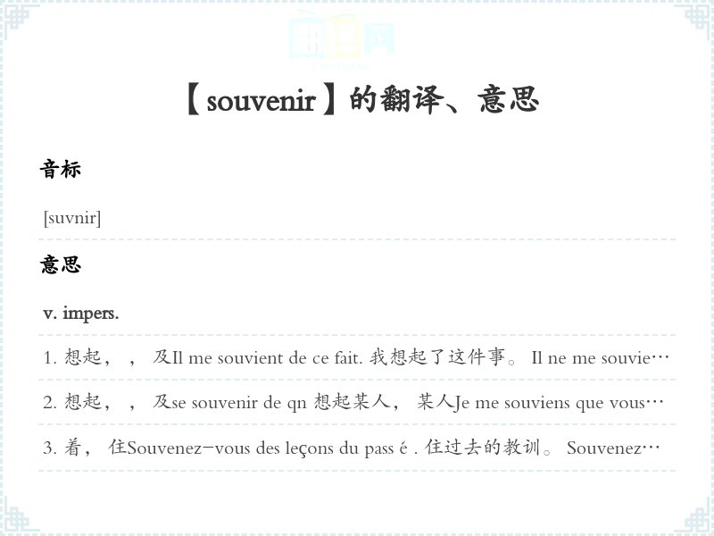 1.souvenir n.m. ,;纪念物,纪念品;pl. 录