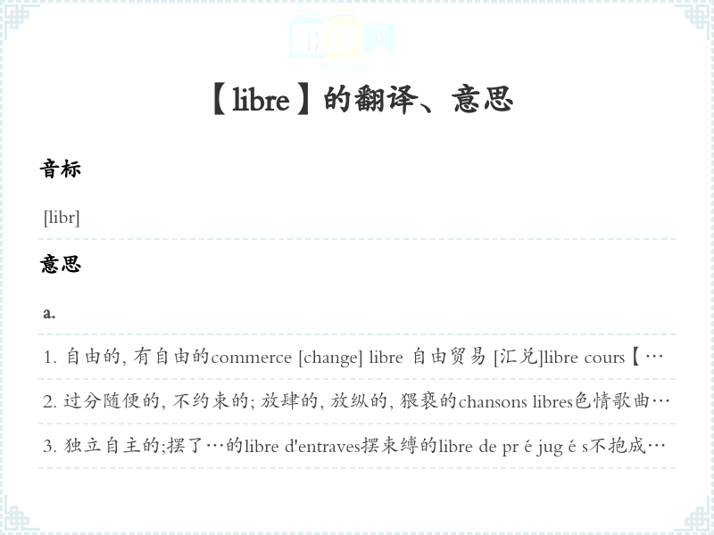 独立自主的;摆了…的libre d'entraves摆束缚的libre de préjugés不抱成见的libre de décider自主做决定Libre à vous d'accepter ou de refuser.接或拒绝, 随您的便。