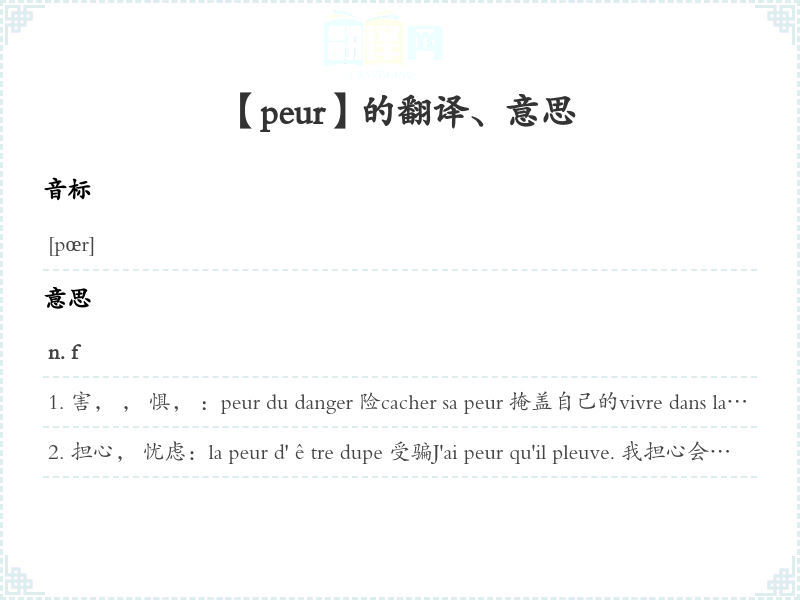 担心, 忧虑:la peur d'être dupe 受骗J'ai peur qu'il pleuve. 我担心会下雨de / par peur de loc.prép. 由于害, 担心s'abstenir de manger de peur d'être étouffé 因噎废食de / par peur que loc.conj. 生, , 担心[后接subj. ]Heureusement, plus de peur que de mal. 幸好,这只是虚一场。Ils parlent tout bas de peur qu'on ne les entende. 他们讲话声特别小,生别人听到了。