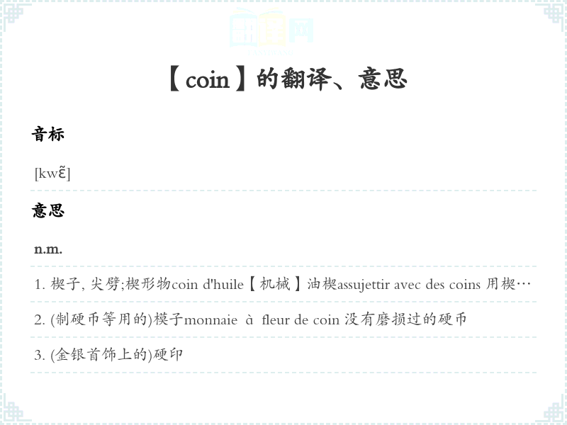 楔子, 尖劈;楔形物coin d'huile【机械】油楔assujettir avec des coins 用楔子固定enfoncer un coin dans [entre]...〈转义〉在…中插一手 [指分离、破坏团结]