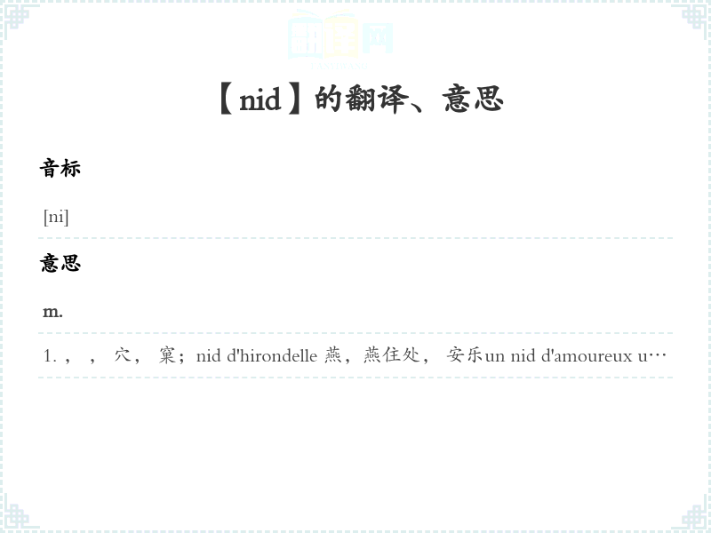 , , 穴, 窠;nid d'hirondelle 燕,燕住处, 安乐un nid d'amoureux un nid douillet 安乐