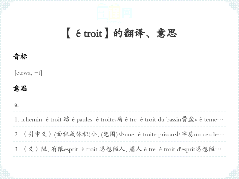〈引申义〉(面积或体积)小, (范围)小une étroite prison小牢房un cercle étroit de relations〈转义〉小交际圈子mot pris dans son sens étroit 〈转义〉作义解释词
