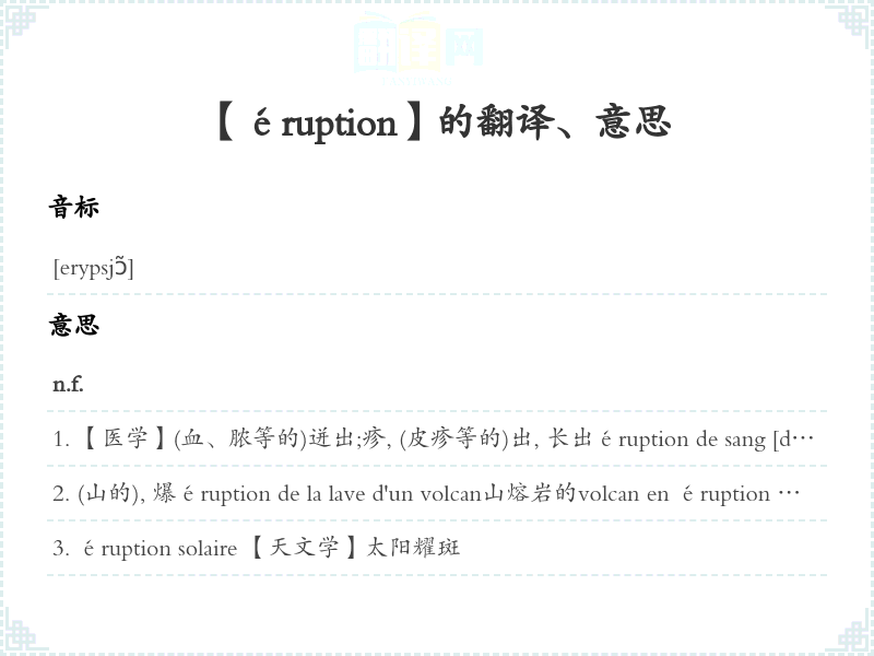 【医学】(血、脓等的)迸出;疹, (皮疹等的)出, 长出éruption de sang [de pus]血 [脓] 的迸出éruption de rougeole麻疹的疹éruption de furoncles疖子的长出éruption dentaire牙的萌出, 出牙