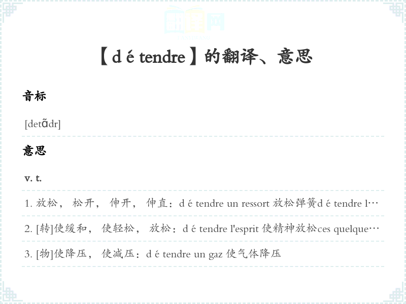 [转]使缓和, 使轻松, 放松:détendre l'esprit 使精神放松ces quelques jours à la campagne l'ont détendu. 在乡下小住几日使他到了放松。
