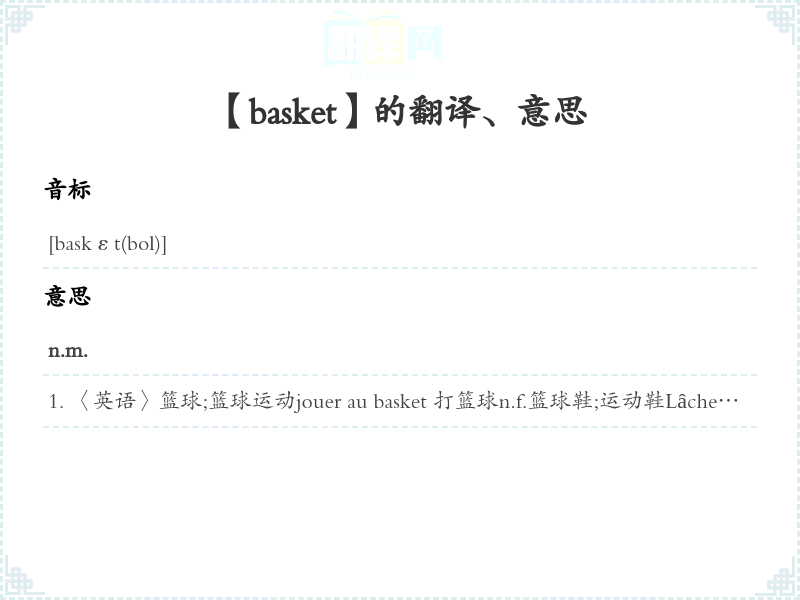 〈英语〉篮球;篮球运动jouer au basket 打篮球n.f.篮球鞋;运动鞋Lâche-moi les baskets.〈口语〉别烦我。让我安静点。faire basket 〈口语〉溜走