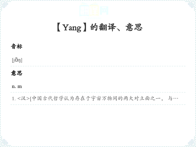 <汉>[中国古代哲学认为存在于宇宙万物间的两大对立面之一, 与“阴”相对]汉>