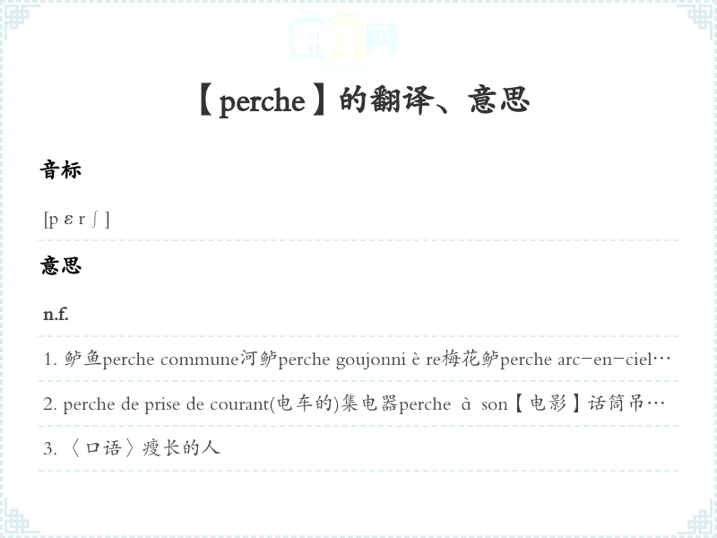 perche de prise de courant(电车的)集电器perche à son【电影】话筒吊saut à la perche 【】撑跳高conduire un bateau à la perche 用篙撑船tendre la perche à qn〈转义〉拉某人一把