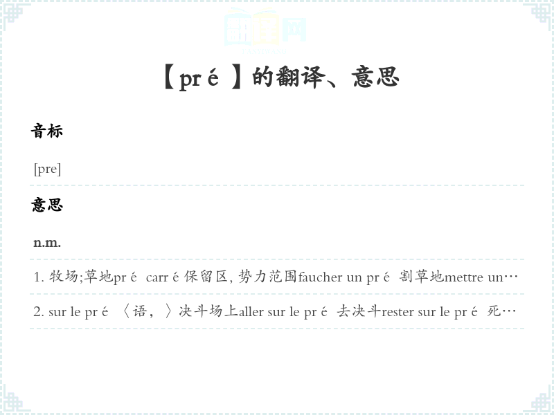 sur le pré 〈语,〉决斗场上aller sur le pré 去决斗rester sur le pré 死于决斗