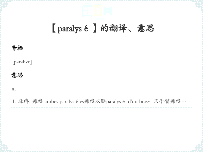 麻痹, 瘫痪jambes paralysées瘫痪双腿paralysé d'un bras一只手臂瘫痪paralysé du côté droit右侧瘫痪— n.麻痹人, 瘫痪人