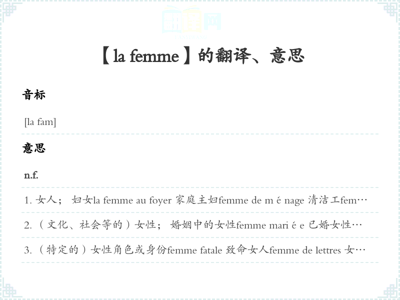 (特定的)女性角色或身份femme fatale 致命女人femme de lettres 女作家femme de théâtre 女演员