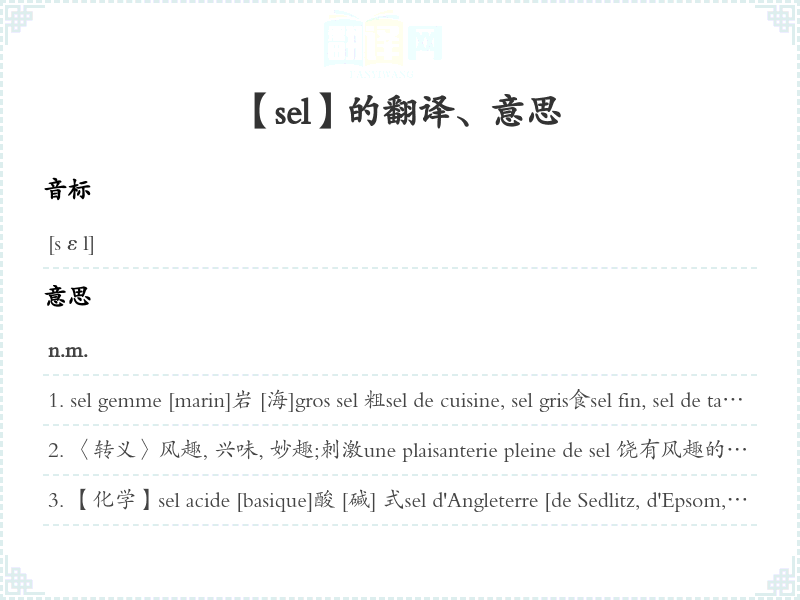 sel gemme [marin]岩 [海]gros sel 粗sel de cuisine, sel gris食sel fin, sel de table细, 精régime sans sel 忌食谱, 忌饮食mettre du sel 放Ce potage manque de sel .这汤不够咸。être changé en statue de sel 〈转义〉呆若木鸡, 茫然不知所措le sel de la terre〈转义〉社会中坚;优秀分子, 高尚的人
