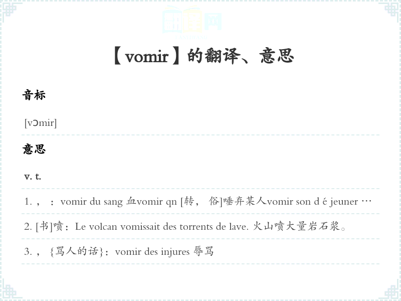 , :vomir du sang 血vomir qn [转, 俗]唾弃某人vomir son déjeuner 把吃的早饭掉avoir envie de vomir 想, 恶心Cela donne envie de vomir. C'est à vomir. 真令人作。