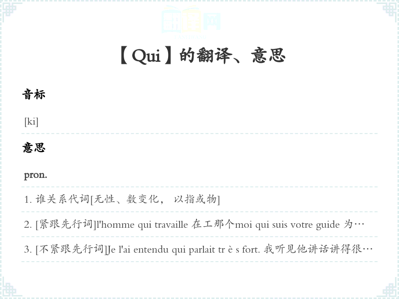 [用宾语或状语]De qui parlez-vous? 你们在讲谁啊?De qui est-il si fier? 他为谁感到如此自豪?A qui vas-tu donner ce livre ? 你要把这本书给谁?C'est à qui... 看谁…,争着…