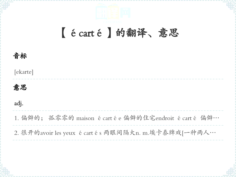 很开的avoir les yeux écartés 两眼间隔大n. m.埃卡泰牌戏[一种两人玩的32张纸牌戏]jouer à l'écarté sur la table d'écarté 在埃卡泰牌戏桌上玩埃卡泰牌戏