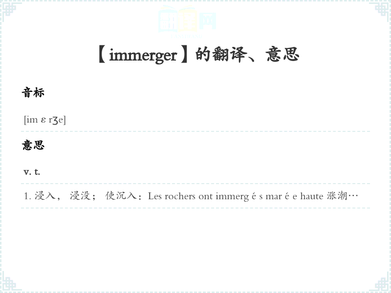 浸入, 浸没; 使沉入:Les rochers ont immergés marée haute 涨潮时浸没。s'~代动词潜入sous-marin qui s'immerge 潜入水中的潜艇faire un séjour à Londres pour s'immerger dans la langue anglaise 为了完全置身于英语环境而在伦敦小住一段时间