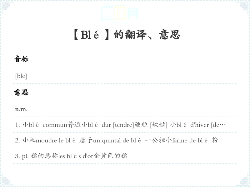 小blé commun普通小blé dur [tendre]硬粒 [软粒] 小blé d'hiver [de printemps]冬 [春] 小tige [épi] de blé 秆 [穗]semer du blé 播种小manger son blé en vert [en herbe]〈转义〉寅吃卯粮