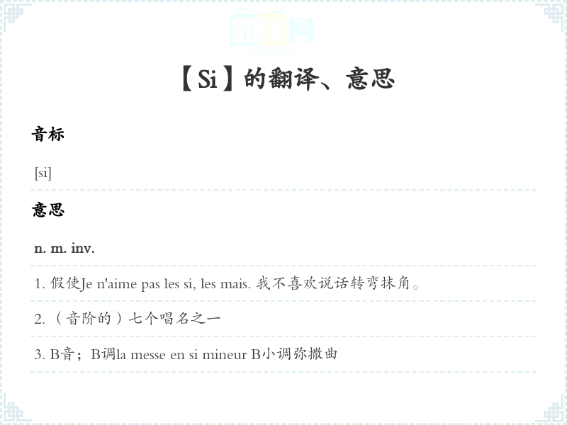Si [化]元素硅(silicium)的符号conj.[在il,ils前省略s']A [在假设的从句中] 如果,假使,只要