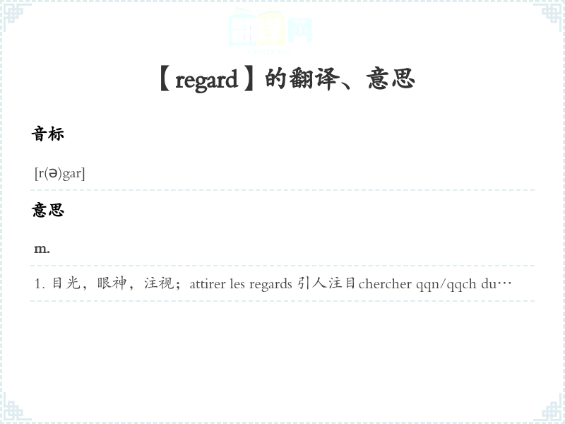 目光,眼神,注视;attirer les regards 引人注目chercher qqn/qqch du regard 用目光搜寻某人/某物parcourir du regard 扫视un regard tendre 一道温柔的目光