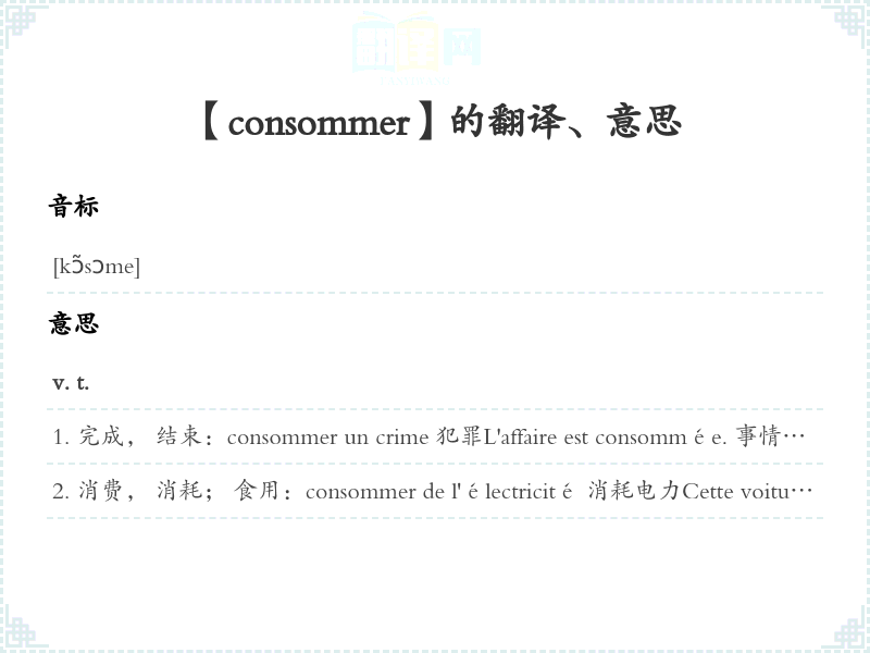 消费, 消耗; 食用:consommer de l'électricité 消耗电力Cette voiture consomme trop (d'essence) 这辆汽车耗油太。v. i.(啡馆)饮用:consommer au comptoir 站酒柜前喝se consommer v. pr.被完成; 被消费, 被消耗, 被食用