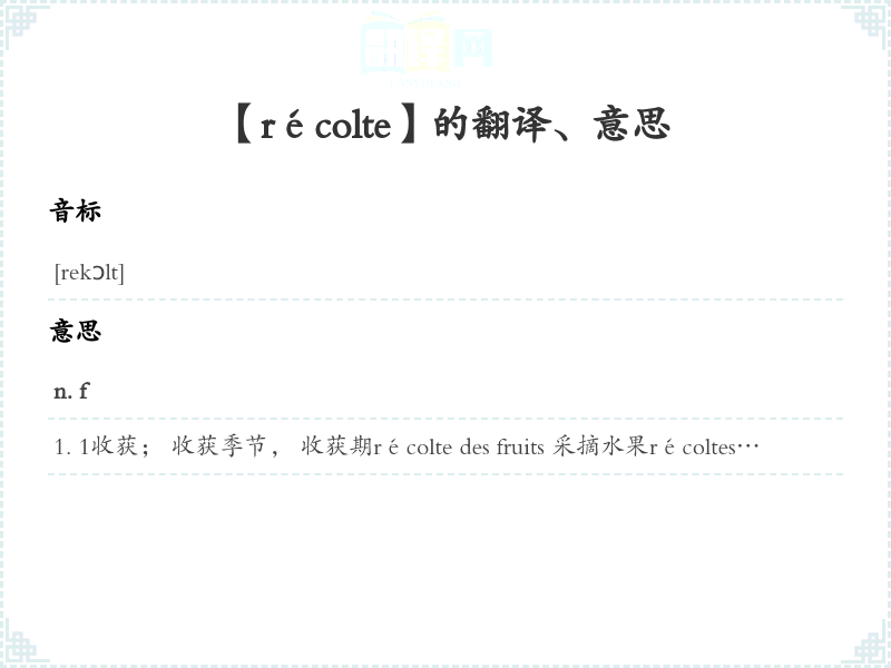 1收获; 收获季节, 收获期récolte des fruits 采摘水果récoltes automnales 秋收2<引>采集récolte du miel 采蜜3收获物, 收成le métayer doit au propriétaire une part de la récolte. 佃需将收成的上交给地主。4<转>收集, 获得; 成果, 结果, 后果转>引>une ample de récolte d'observations 收集大量的意见