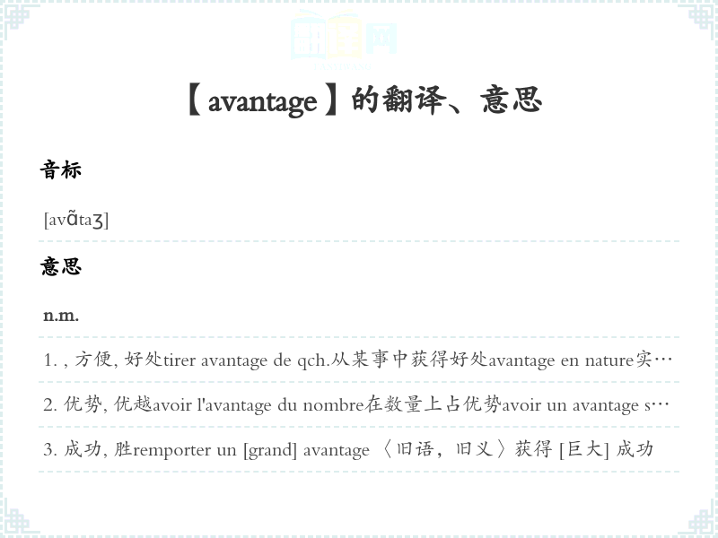 优势, 优越avoir l'avantage du nombre在数量上占优势avoir un avantage sur qch.某事占优势avoir un avantage sur qn比某人强à l'avantage de qn某人有être à son avantage 胜过平时prendre qn à son avantage 乘机攻击某人