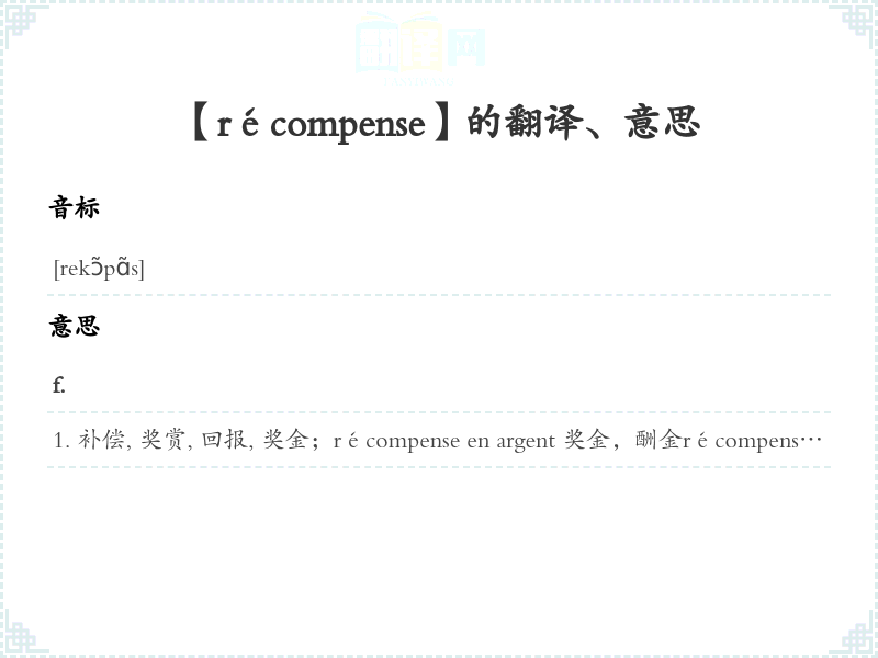 补偿, 奖赏, 回报, 奖金;récompense en argent 奖金,酬金récompense scolaire 学校奖赏,奖品accorder une récompense 批准奖励donner une récompense 给奖励si vous me faites une commission, vous aurez une récompense 如果您能帮我忙,您将得到报酬<讽>惩罚, 报应讽>mériter une récompense 受到应有惩罚il a désobéi et il a eu la récompense qu'il méritait 他拒不服从而受到应有惩罚