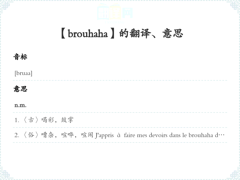 〈俗〉嘈杂,喧哗,喧闹 J'appris à faire mes devoirs dans le brouhaha des voix (Beauvoir).我学会了在喧闹中做作业。(波伏瓦)