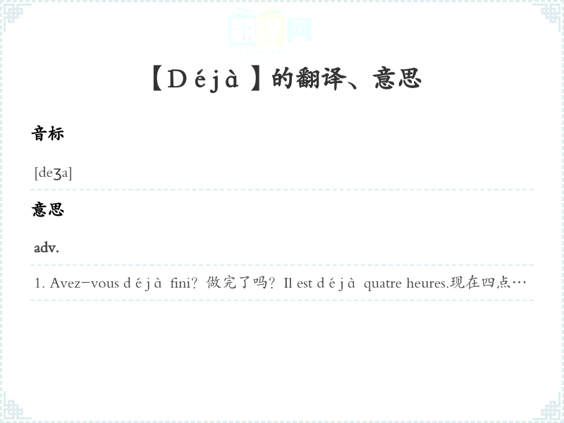 Avez-vous déjà fini?做完了吗?Il est déjà quatre heures.现在四点钟了。Je vous ai déjà dit que...我早跟说过…[表示加强语气]Ce n'est déjà pas si mal.这不算很坏了。[放在句末, 表示忘记对方回答, 重新提问]Comment vous appelez-vous, déjà ?叫什么名字?我忘了。[表示惊讶]Vous? déjà !是?么来了!Déjà prête!准备好啦!d'ores et déjàloc.adv.从今以后