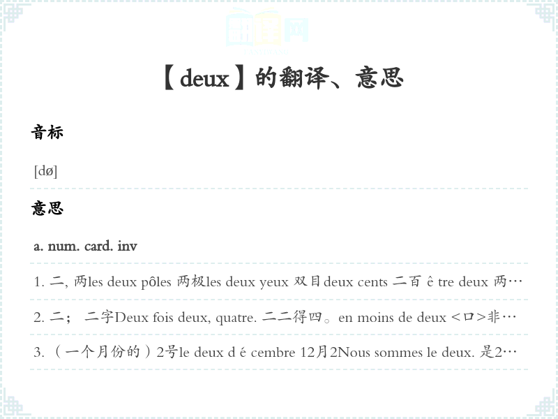 二, 两les deux pôles 两极les deux yeux 双目deux cents 二百être deux 两人在一起vivre à deux 两人生活在一起a. num. ord. inv第二article deux 第二条chapitre deux 第二章à deux heures 在两点钟n. m. inv.