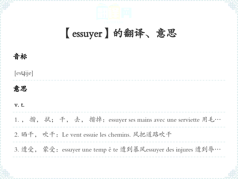 , 揩, 拭; 干, 去, 揩掉:essuyer ses mains avec une serviette 用毛巾把手干essuyer ses pieds (在鞋上)把鞋底干净essuyer des meubles 把家具揩干净essuyer l'eau qui a coulé sur la table 把流在桌上的水掉essuyer les larmes de qn 干某人的眼泪; [转]安慰某人essuyer les plâtres, essuyer les murs [转, 俗](1)搬进新屋(2)(初次尝试者)吃亏, 倒霉
