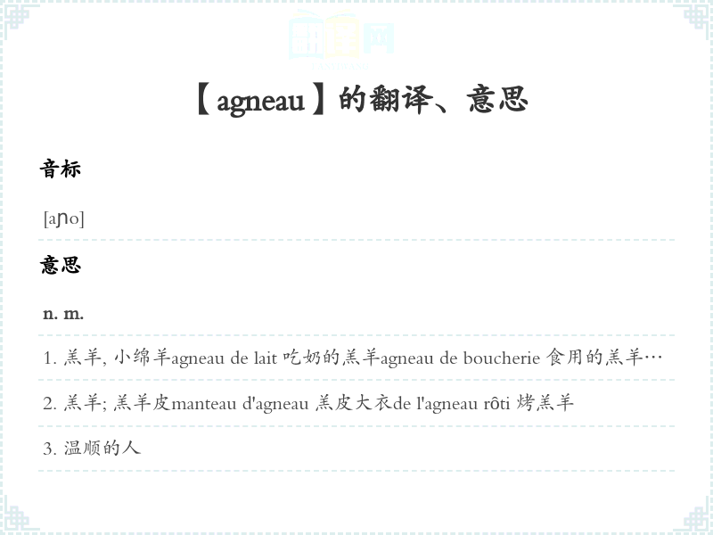 羔羊, 小绵羊agneau de lait 吃奶的羔羊agneau de boucherie 食用的羔羊doux comme un agneau 羔羊般地温顺agneau pascal (犹太人)逾越节宰杀的羔羊