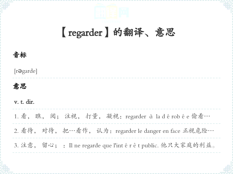 看, 瞧, 阅; 注视, 打量, 凝视:regarder à la dérobée 偷看regarder par la fenêtre 从窗口向外看regarder qn en face 直视某人regarder qn de haut en bas 上下打量某人regarder de haut 傲视regarder sa montre 看表, 看时间regarder une émission de télévision 观看电视regarder un livre pour y chercher un renseignement 在一本书中查阅资料J'ai regardé partout. 我已过。 partir sans regarder derrière soi 头也不回地走了Regardez-moi faire. 你看着我做。 Regardez-moi ce travail! 你看看这个活儿!Regardez voir dans le placard s'il y est. [俗]看看壁橱有没有。 Vous ne m'avez pas regardé! 你看清楚我是不是会上这个当!你别拿我当傻瓜!