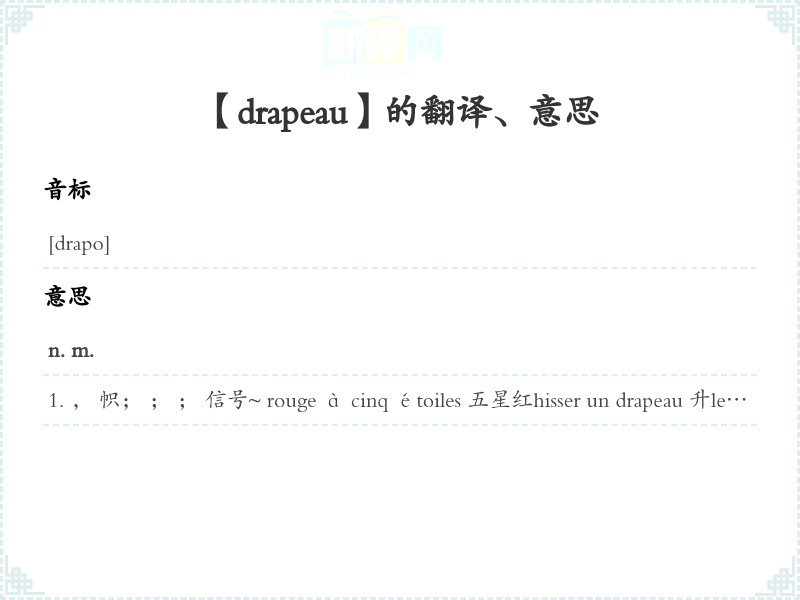, 帜; ; ; 信号~ rouge à cinq étoiles 五星红hisser un drapeau 升le drapeau tricolore 法三色