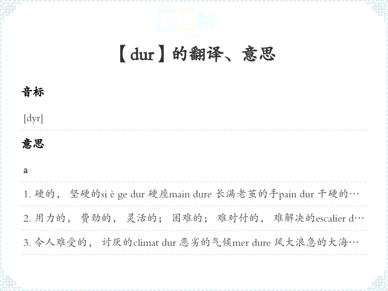 严厉的, 严酷的, 严峻的; 痛苦的, 困苦的; 沉重的de durs combats 激烈的战斗une dure punition 严厉的惩罚vie dure 艰苦的生活,刻苦的生活