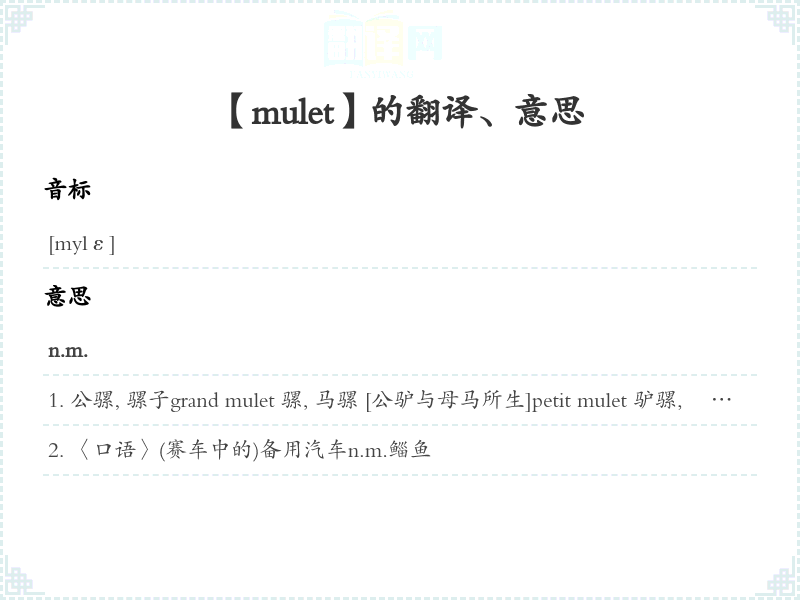 公骡, 骡子grand mulet 骡, 马骡 [公驴与母马所生]petit mulet 驴骡, [公马与母驴所生]chargé comme un mulet 〈口语〉像骡子一样扛着很重的东西