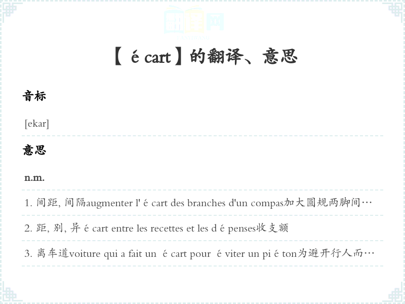 【工程技术】écart probable标, 概率écart en portée【军事】距离angle d'écart initial【军事】起始向角écart inférieur【机械】下限écart type【数学】均方根à l'écartloc.adv.在一边, 不参与rester à l'écart 呆在一边;袖手旁观mettre qn à l'écart 把某人撇在一边tenir qn à l'écart 〈转义〉把某人排斥在外, 不某人参加, 不某人知道à l'écart deloc.prép.远离…, 与…有一定距离maison à l'écart du village离村庄房屋se tenir à l'écart de l'agitation politique不介入政治风波n.m.