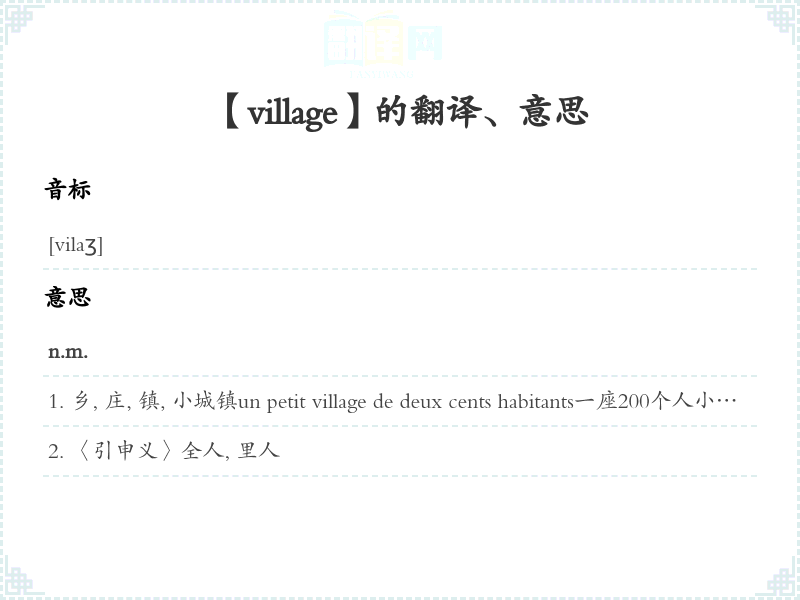 乡, 庄, 镇, 小城镇un petit village de deux cents habitants一座200个人小庄village olympique奥林匹克village club, village -club乡俱乐部village de montagne山village de toile(勘探队等)帐篷village de vacances, village -vacances度假être bien de son village 〈转义〉稚;没有见过世面