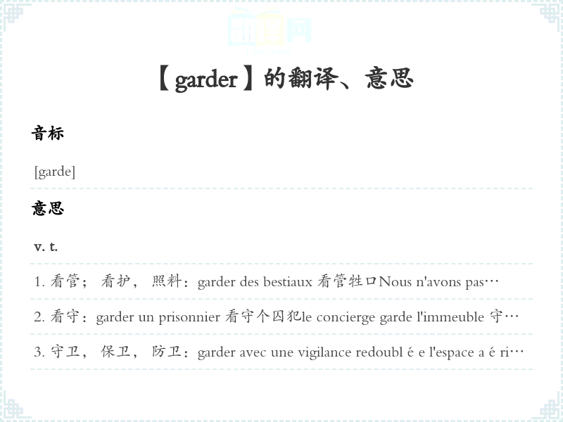看管; 看护, 照料:garder des bestiaux 看管牲口Nous n'avons pas gardé les cochons ensemble. [转, 俗]咱们不是熟朋友。 [用来责备对方对自己太随便, 太不讲礼貌]garder des enfants 照管孩子garder à vue 看牢, 严密看管